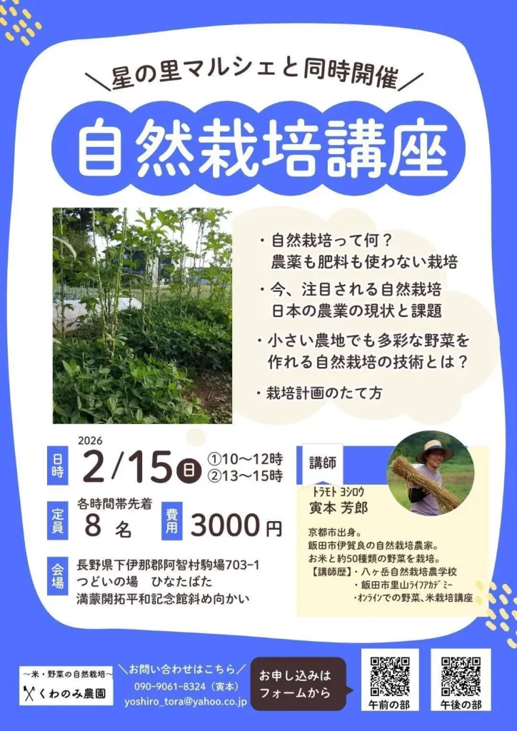 自然栽培に興味のある方へ 阿智村・ひなたばたで「自然栽培講座」を開催します。 2026年2月15日(日)、長野県下伊那郡阿智村のひなたばたにて、「自然栽培講座」を開催します。 農薬も肥料も使わず、自然の力を活かして野菜やお米を育てる—— そんな自然栽...
