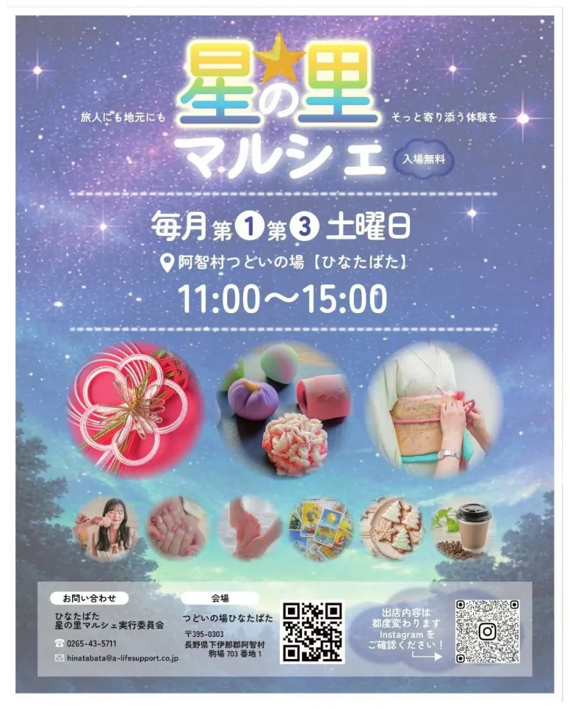 旅人にも、地元にもそっと寄り添う「星の里マルシェ」 星の里マルシェは、長野県下伊那郡阿智村にある ひなたばた を会場に、毎月第1・第3土曜日に開催される小さなマルシェです。 観光で訪れた方も、地域に暮らす方も、ふらっと立ち寄って、少し立ち止ま... -