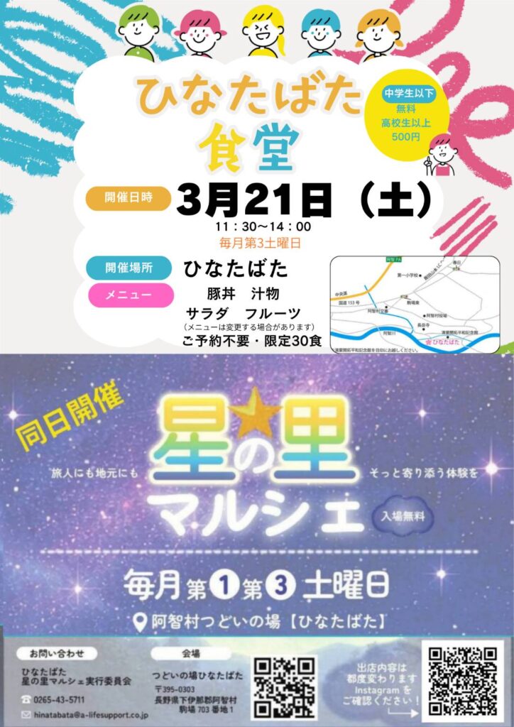 3月21日(土)、阿智村「つどいの場 ひなたばた」にて「ひなたばた食堂」と「星の里マルシェ」を開催します。 ひなたばたは、子どもから大人まで、誰でもふらっと立ち寄れる地域の居場所として開かれている場所です。 ちょっと誰かと話したいとき。 外に出... -